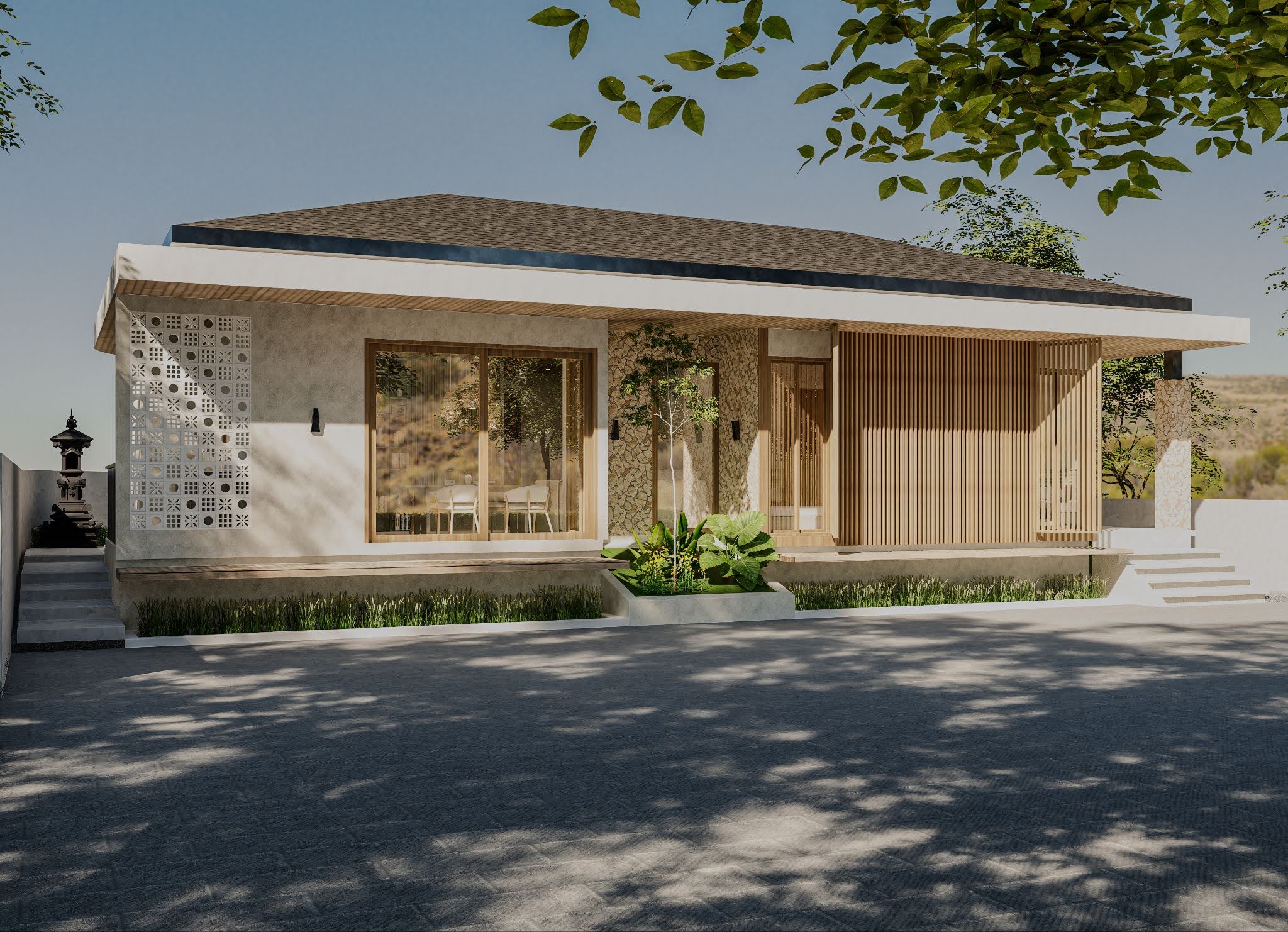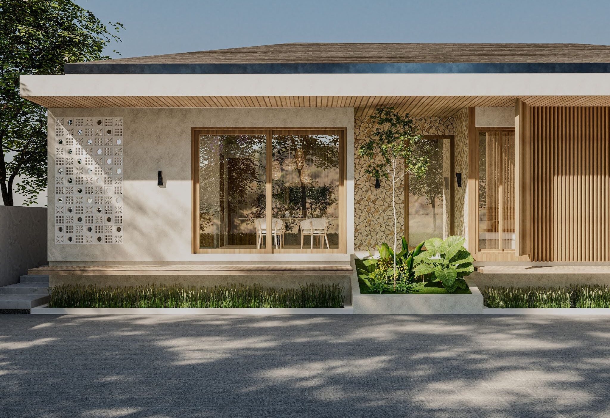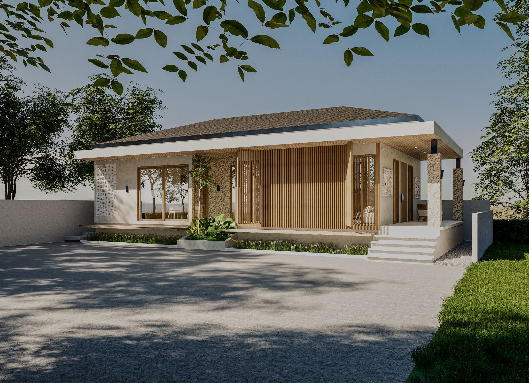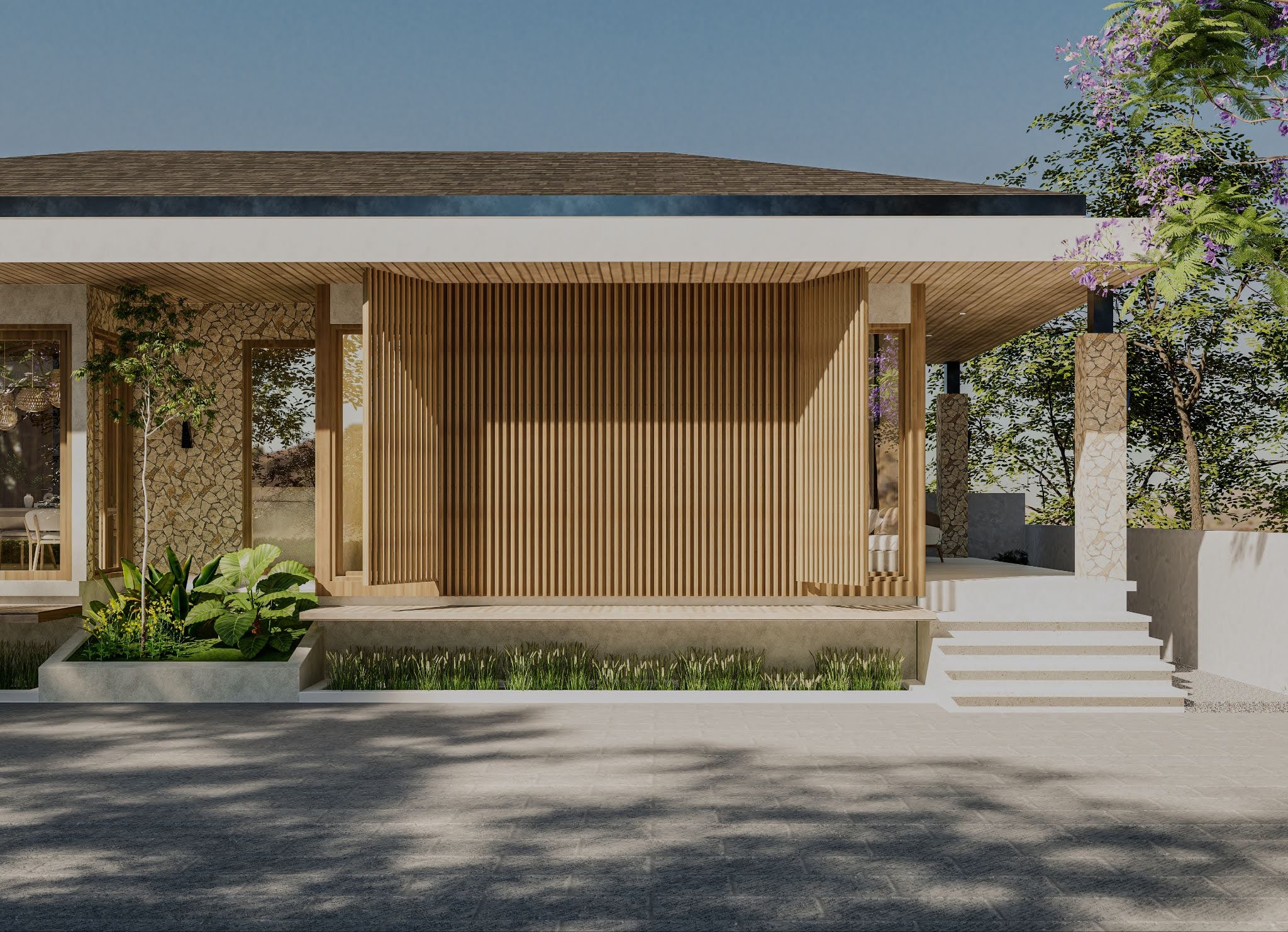 At the front, a series of floating steps and a covered terrace lead to the main entrance. The layout is straightforward, with clear separation between public and private areas. Large openings allow natural light and cross ventilation, supporting a healthy indoor environment.