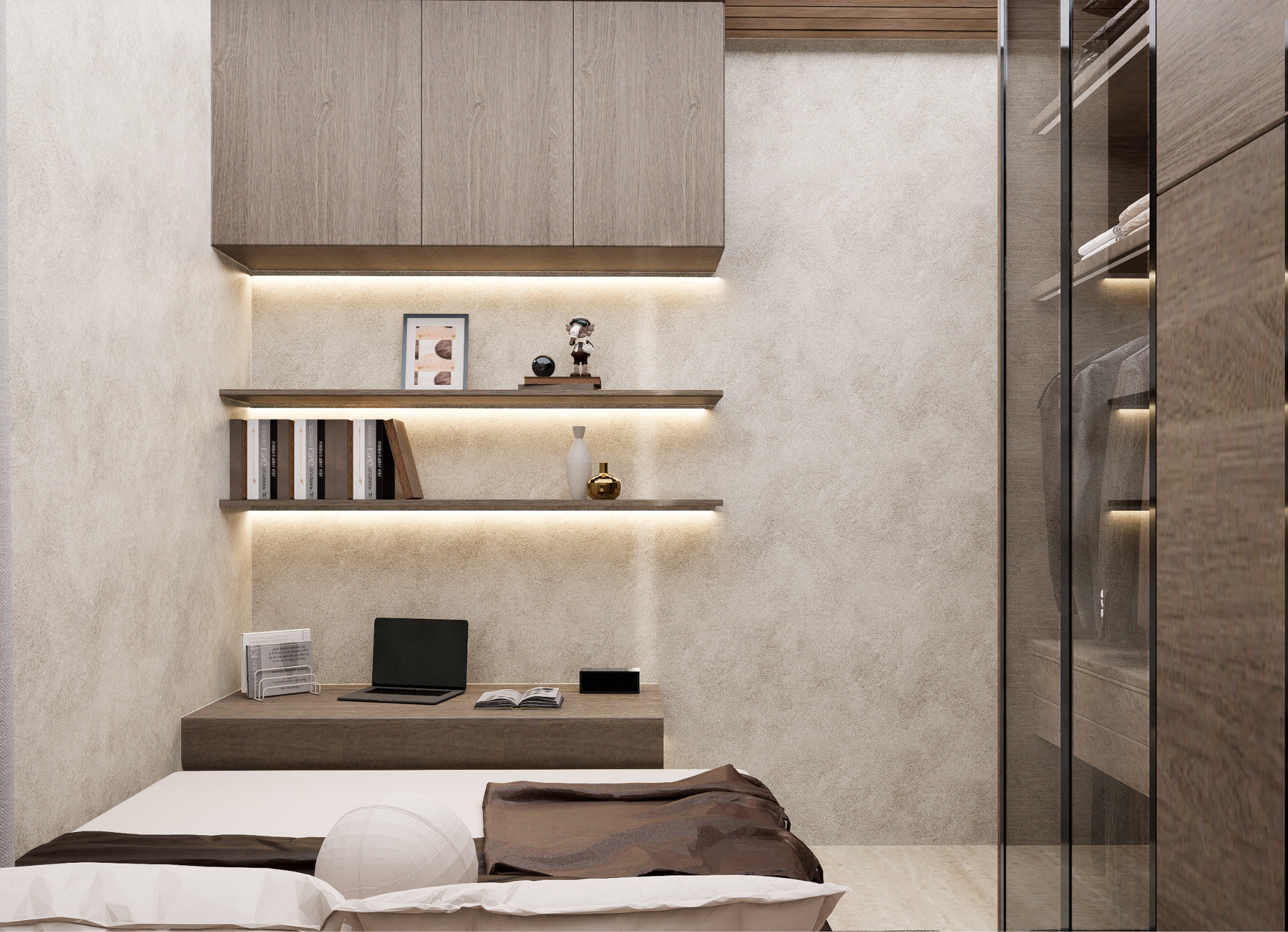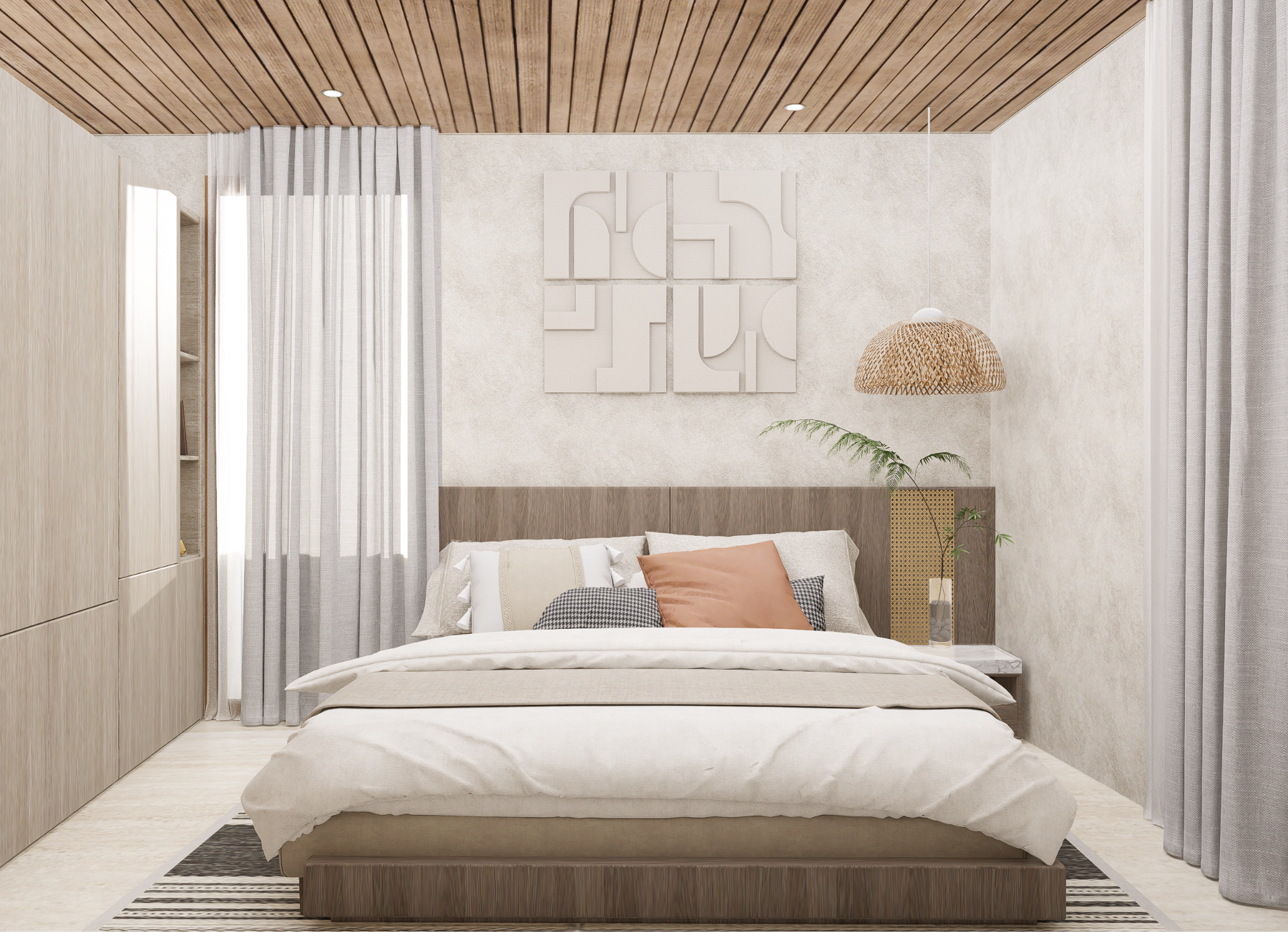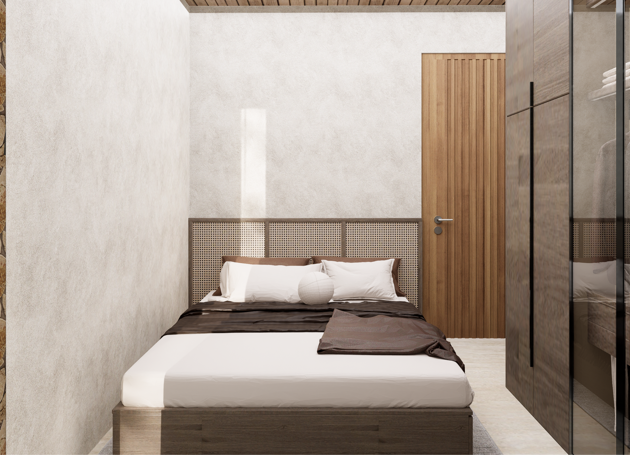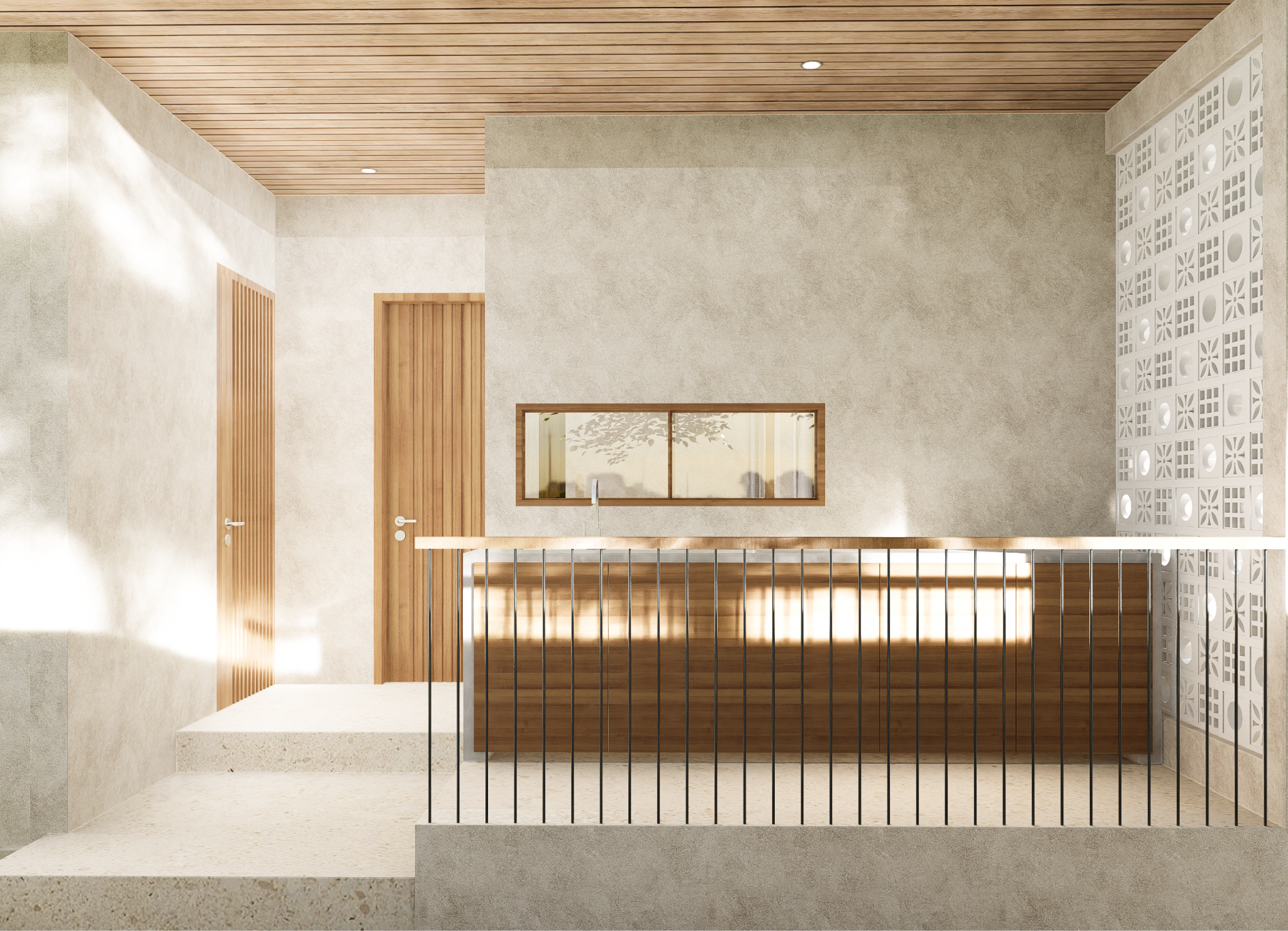 At the front, a series of floating steps and a covered terrace lead to the main entrance. The layout is straightforward, with clear separation between public and private areas. Large openings allow natural light and cross ventilation, supporting a healthy indoor environment.