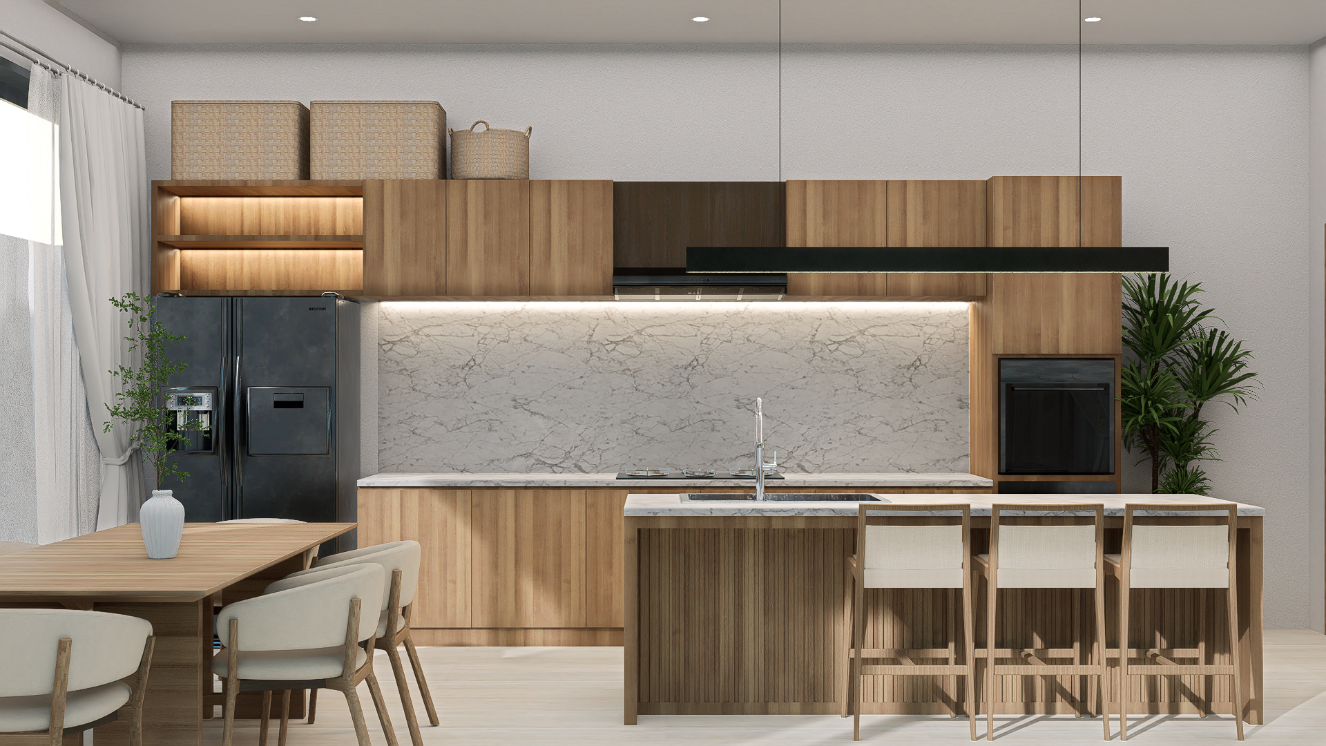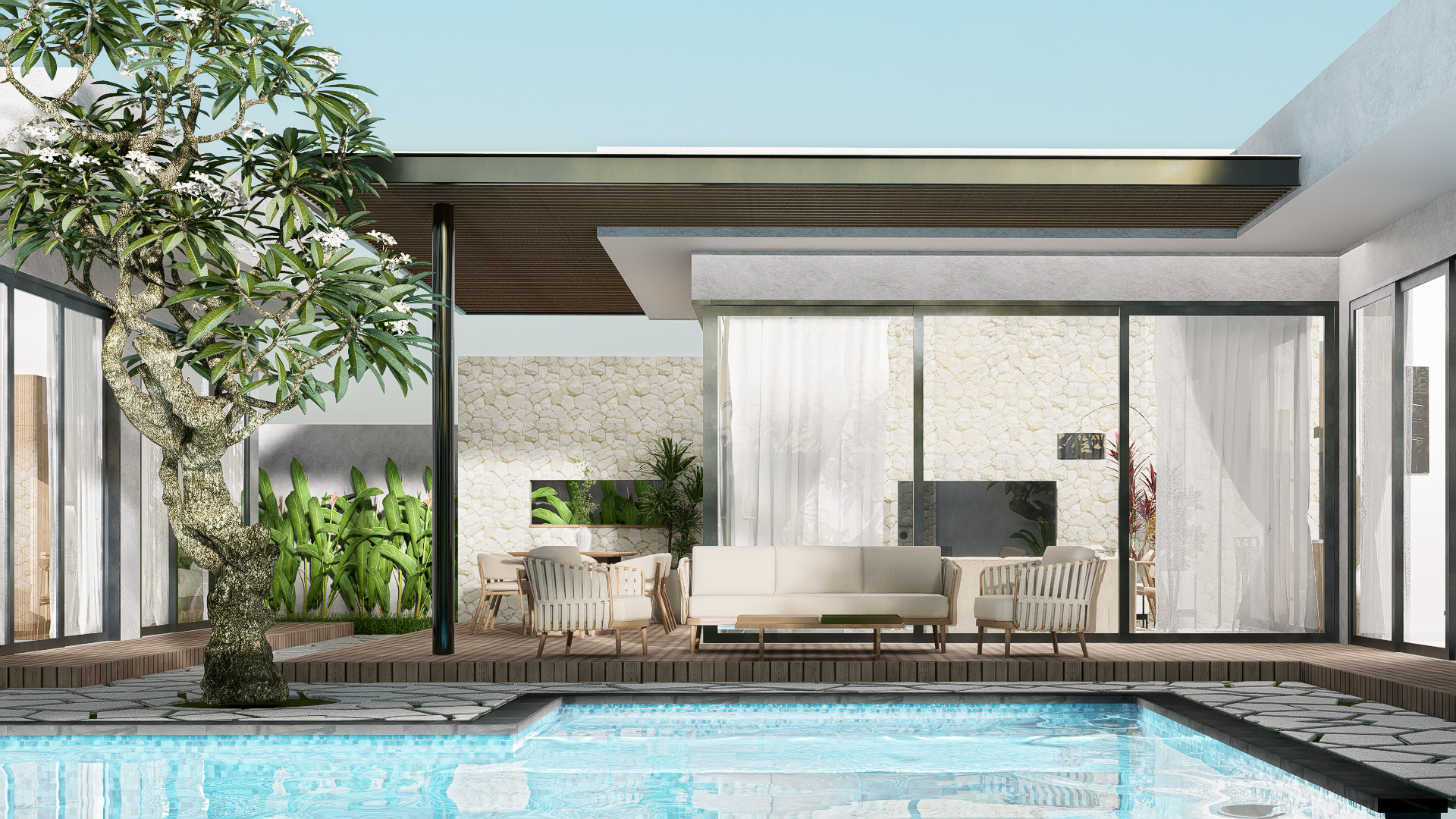 The 250 m² villa presents a generous three bedroom arrangement, ideal for families or small groups, with an open plan living and dining area connected seamlessly to the pool and BBQ area, framed by lush greenery.