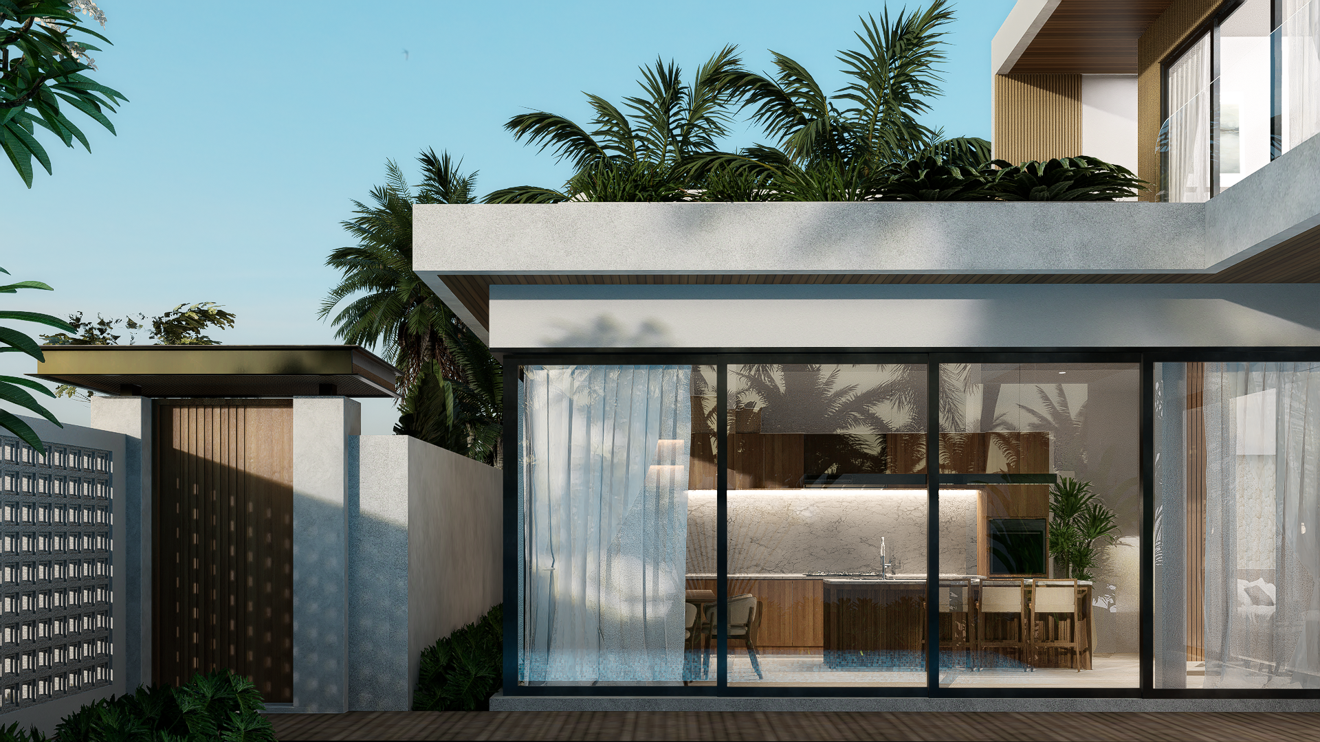 The 180 m² unit offers a compact two bedroom layout featuring an airy living space, a tropical outdoor shower, and a rooftop BBQ terrace with views over the pool.